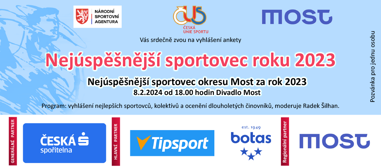 dovolujeme si Vás pozvat na vyhlášení ankety „Nejúspěšnější sportovec roku 2023“, které se uskuteční dne 8. 2. 2024 od 18:00 hodin v Městském divadle v Mostě.