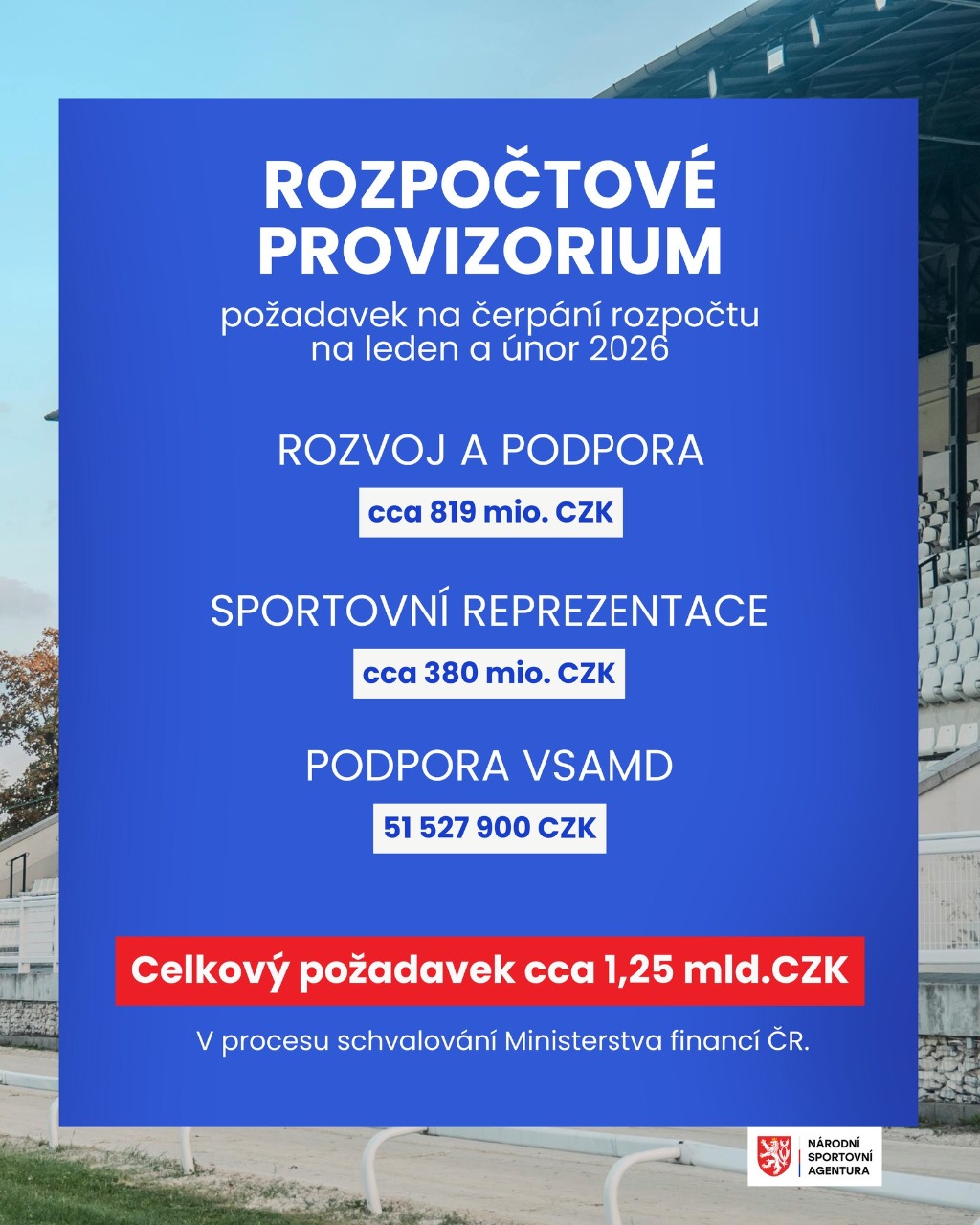 Místopředseda NSA uvedl, že agentura požádala Ministerstvo financí ČR o maximum finančních prostředků na měsíce leden a únor 2026 v celkové výši 1,25 mld. Kč. Struktura a výše výplat sportovním svazům, se bude odvíjet od skutečně poskytnutého objemu finančních prostředků ze strany Ministerstva financí, a při rozhodování o struktuře a objemu plateb NSA zohlední blížící se Zimní olympijské hry 2026.